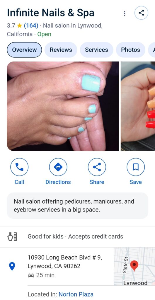 “Wonderful pedicures, manicures, and full sets of acrylic or gel nails.”