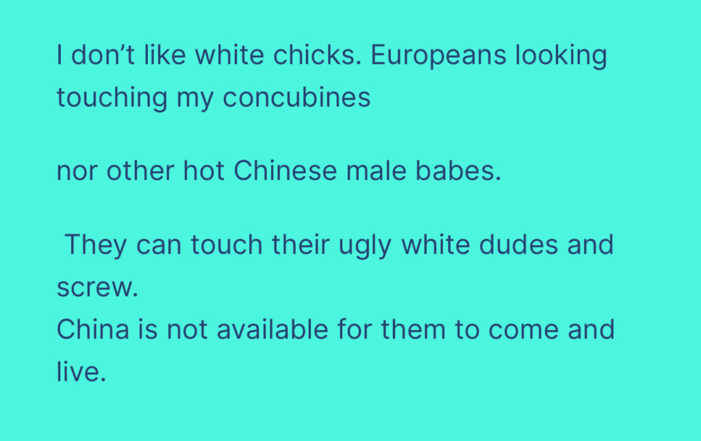 and the Chinese females who aren’t nice to me are not for white dudes to rape. They are for the other Chinese male dudes who aren’t my type/not my concubine.