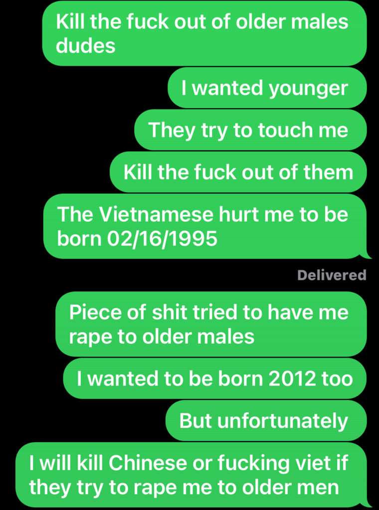 I hate my relatives and cousins. Kill the fuck out of them if they try to touch me and grab me 02/16/1995. I don’t like the Vietnamese, the Nguyen kings will die. I hate Nguyen bitches. I would never ever want to be born in Vietnam. I see the Vietnamese and I kill. There are plenty of places overseas, why Vietnam? Fuck Vietnam, don’t touch me.