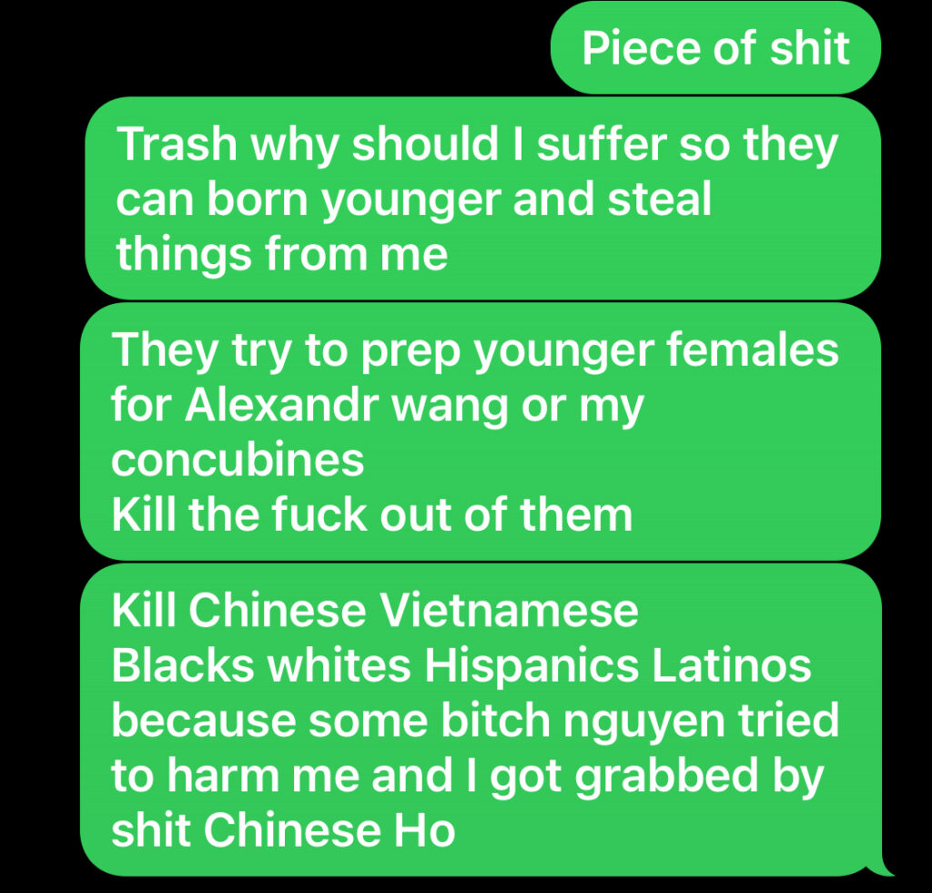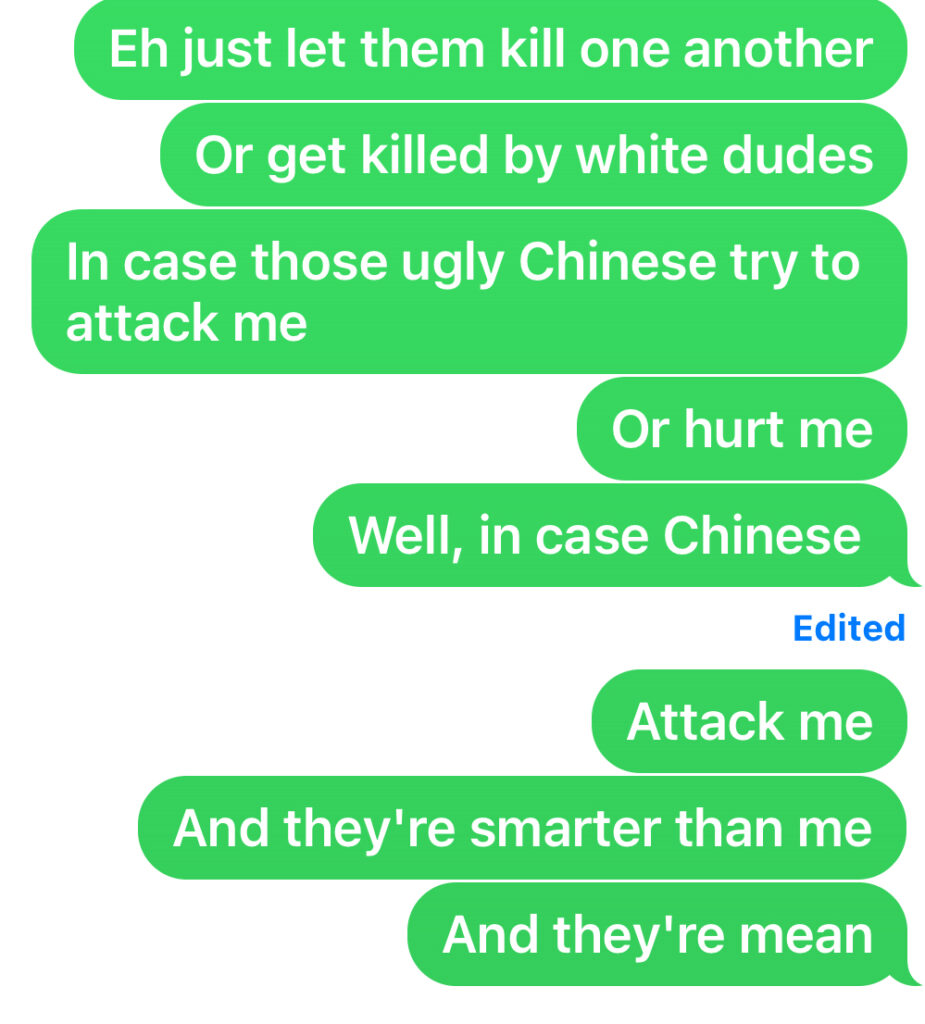 the Vietnamese play mean and I don’t like their ways of living, don’t ever grab me to be born in Vietnam. If I see Thailand Filipinos or southeast Asians I hit them because I hate southeast Asians.