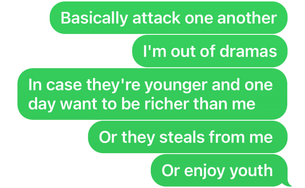 I did not like the threats. I prefer to be only child or the youngest and enjoy youth and life.